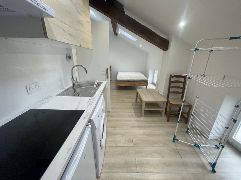 L'agence Solygest vous propose à la location ce beau studio d'une surface de 19.37m², meublé et équipé. Il se compose d'une pièce de vie principale, un coin cuisine aménagée et équipée et une salle d'eau avec toilettes.