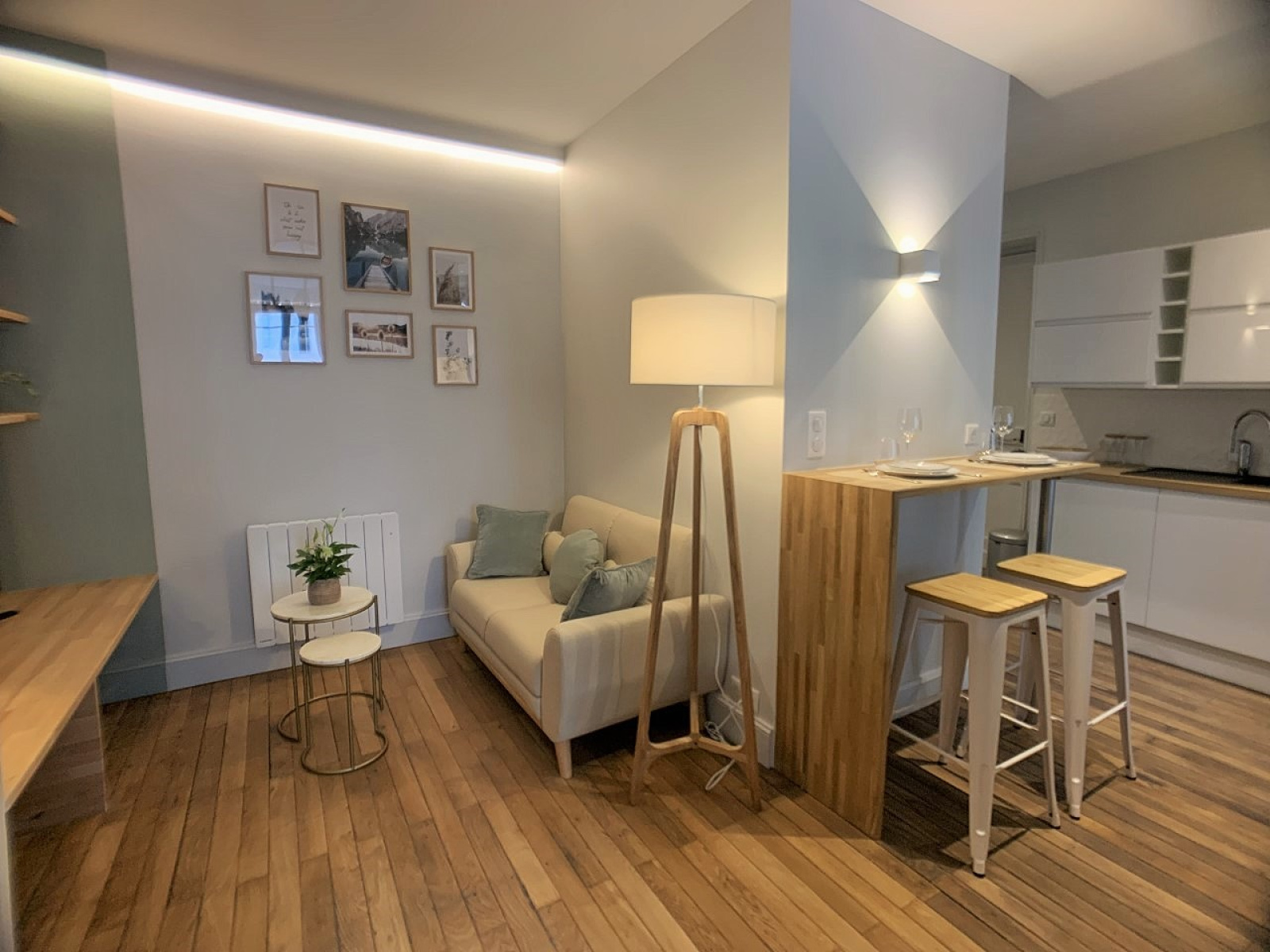 Une pièce de vie principale ouverte sur une cuisine aménagée et équipée, une chambre, une alcôve, une salle de bains et des toilettes séparées.