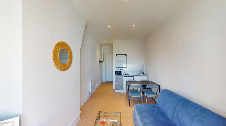 - Pièce de vie principale ouverte sur une kitchenette aménagée et équipée